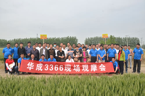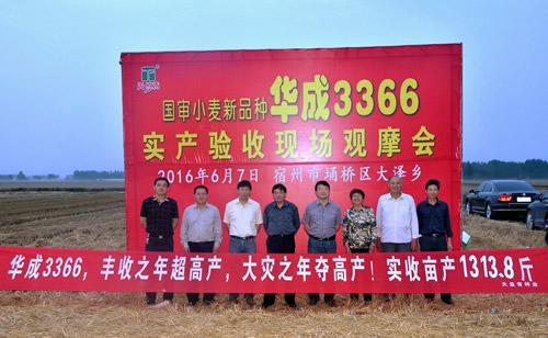 2016年5月7日上午,來(lái)自安徽省內(nèi)的30多家華成3366縣級(jí)代理齊聚宿州夾溝農(nóng)場(chǎng),共同觀摩了超高產(chǎn)小麥華成3366的大面積表現(xiàn)情況。華成3366是宿州市種子公司以煙農(nóng)19(煙優(yōu)361)和宿266(皖麥52優(yōu)系)
